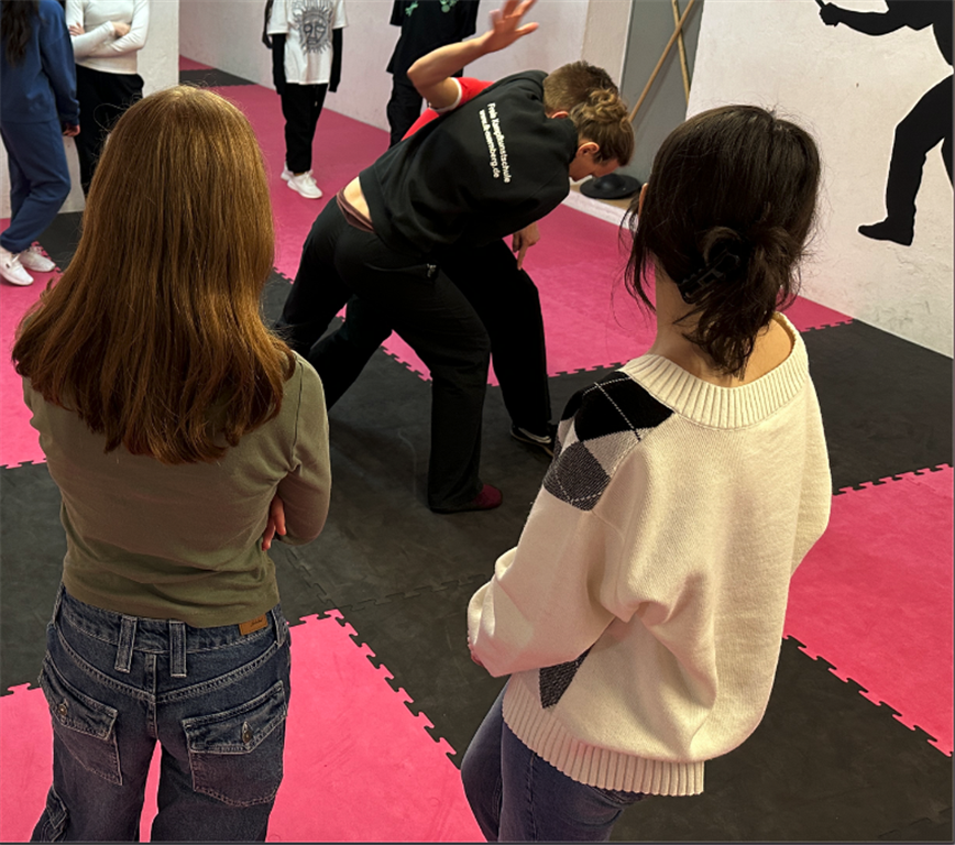 Im Rahmen der Berufsorientierung durften die Schülerinnen der Klassen M7 und 7a dieses Jahr der Modul Selbstbehauptung besuchen. An zwei Nachmittagen bekamen erst die Mädchen, dann die Jungs, von zwei fachkundigen Trainerinnen, eine Einführung in die Kampfkunst des Wing Tsung. Neben körperlichen Abwehr von Angriffen stand natürlich vor allem die Vermeidung von Konflikten auf dem Programm.