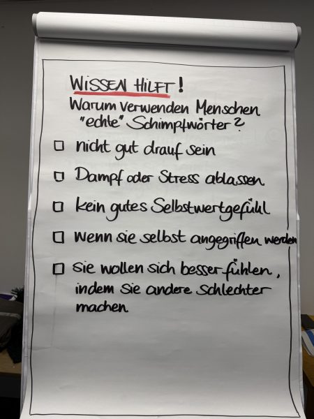 Diesmal durfte die Klasse 6a einen neuen Erfahrungsfeld-Workshop zum Thema „Schimpfwörter drehen“ testen. Die Schüler und Schülerinnen lernten mit Wissen, Technik und Humor die Schimpfwörter zu entkräftigen und sich so zu verteidigen, ohne sich zu beleidigen.